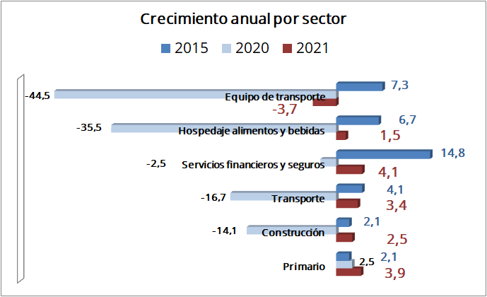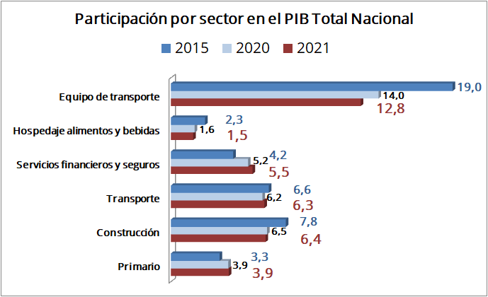 La participación del sector del Transporte, donde figura especialmente la industria automotriz, estuvo en ascenso durante los últimos dos lustros pero tuvo un punto de inflexión en 2020. No obstante, para 2021 recuperará su tendencia a la alza. Su mayor participación en la actividad productiva desde inicios de este siglo la obtuvo en 2019, cifrándose en 7 por ciento. Empero, le tomará al menos cuatro años recuperar los niveles de participación observados en 2019, así como el crecimiento perdido durante 2020, estimado en (-) 16,7 por ciento, y cuya recuperación para 2021 alcanzará el 3.4 por ciento. Destaca que es un sector muy arraigado y sensible al ciclo económico.